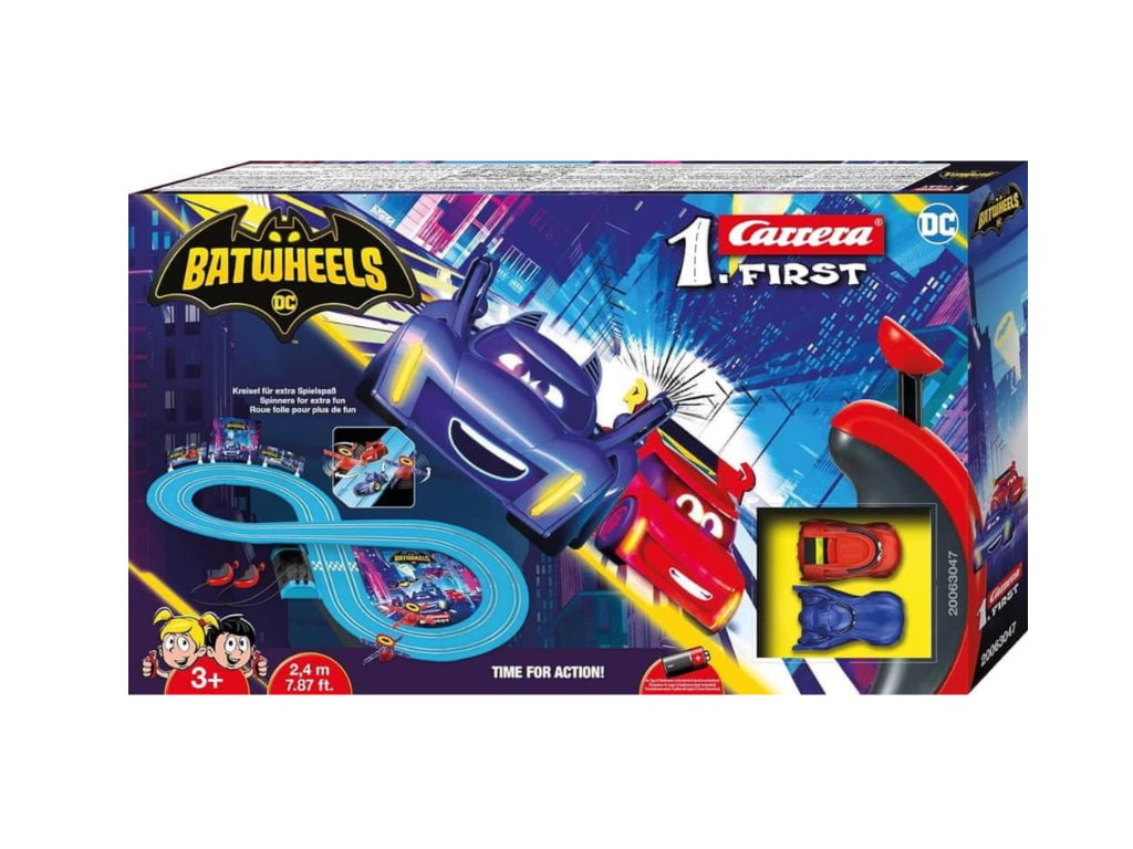 Sada Carrera FIRST "Batwheels - Time for Action" je ultimátní herní závodní autodráha pro juniorské milovníky dobrodružství ve věku od 3 let! Batmanovo auto skočí do akce v sérii Batwheels. „Bam“ je zkratka pro Batmobile. Celý supervýkonný tým podpory superhrdinských vozidel Gotham bojuje v boji proti zločinu. Bat a jeho kamarád Redbird, Robinovo auto, se také připojí k akci na závodní dráze Carrera FIRST. Dvě malá superauta v měřítku 1:50 závodí na jasně modré dráze 2,4 metru v sadě Batwheels Time for Action. Vrtule zaručují další zábavu při hraní. Autodráha Carrera FIRST je perfektním dárkem, který zajistí, že si začínající závodní jezdci užijí nespočet hodin vzrušení.