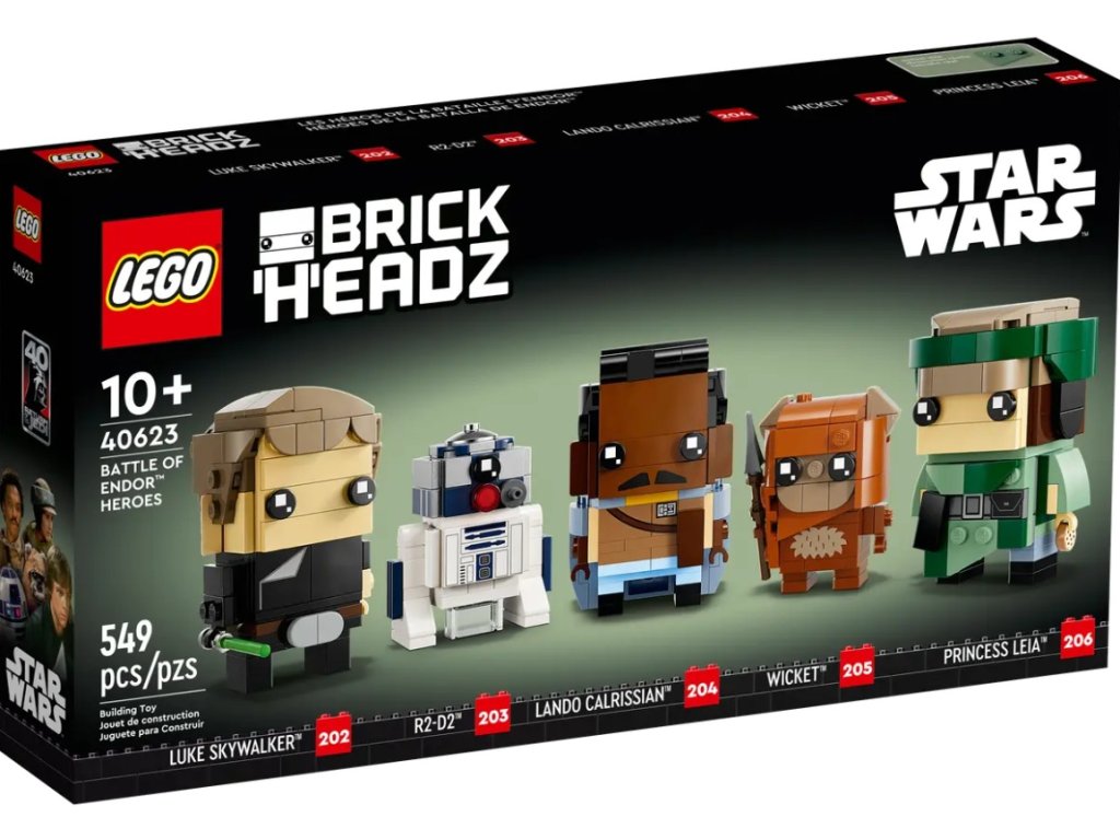 Oslavte 40. výročí filmu Star Wars: Návrat Jediho s 5 Hrdiny bitvy o planetu Endor (40623). Jedná se o skvělý dárek pro fanoušky od 10 let, jehož součástí jsou sestavitelné figurky LEGO® BrickHeadz™ Star Wars™, a to Luke Skywalker, R2-D2, Lando Calrissian, Wicket a princezna Leia v typickém oblečení včetně Lukeova světelného meče, Wicketova kopí a Leiiny svačinky. Kromě sběratelských postav z kostek v sadě najdete také podložky na stavění pro vytvoření výstavky hodné hrdinů.