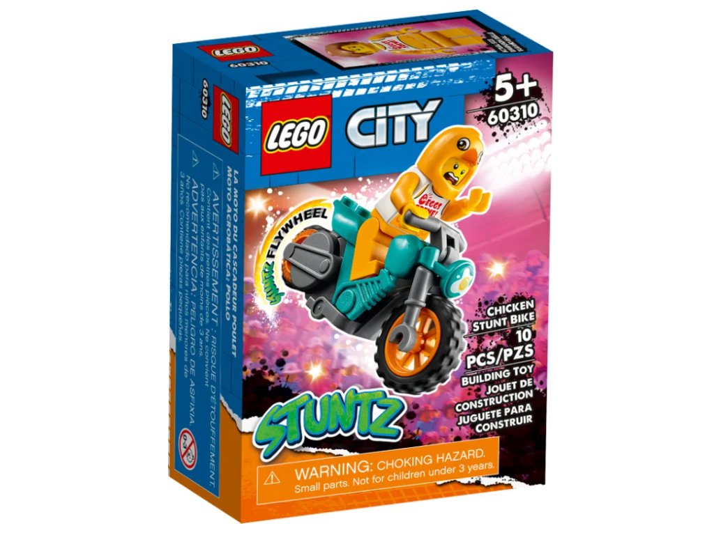 - Stavebnice LEGO® City Motorka kaskadéra Kuřete (60310) nabízí úžasnou motorku se setrvačníkem, s níž můžete předvádět dechberoucí kousky, a také postavu z televizního seriálu LEGO City Dobrodružství.