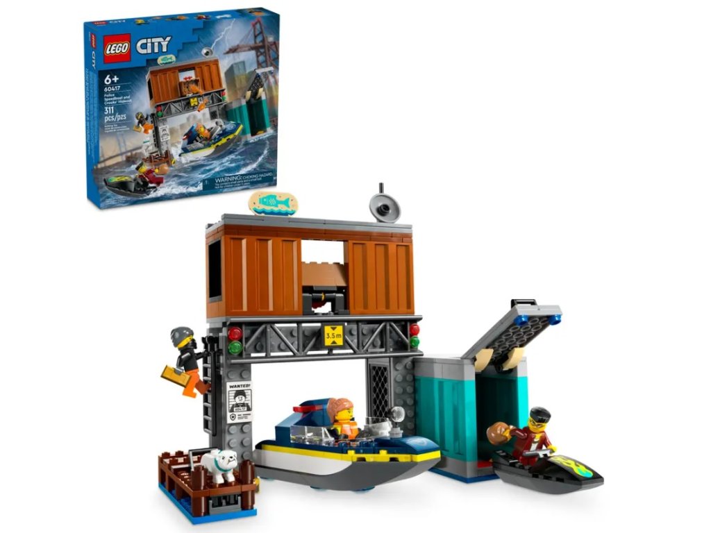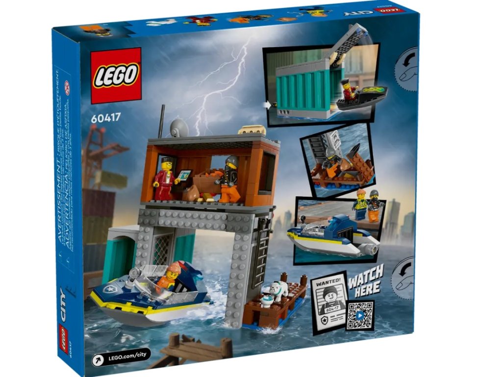 - Co je v krabici? – Vše, co děti potřebují pro sestavení motorového člunu, vodního skútru, doků s nákladními kontejnery a minifigurek policisty, 2 zločinců a figurky buldoka