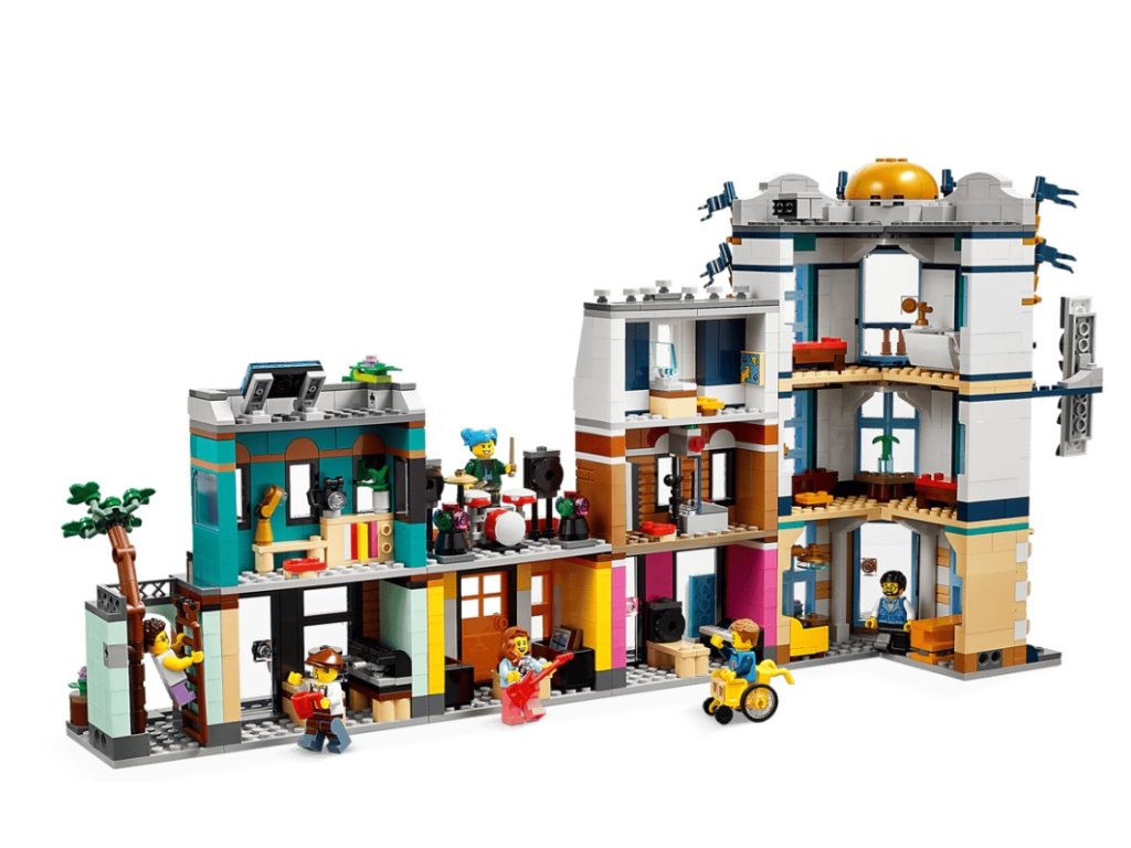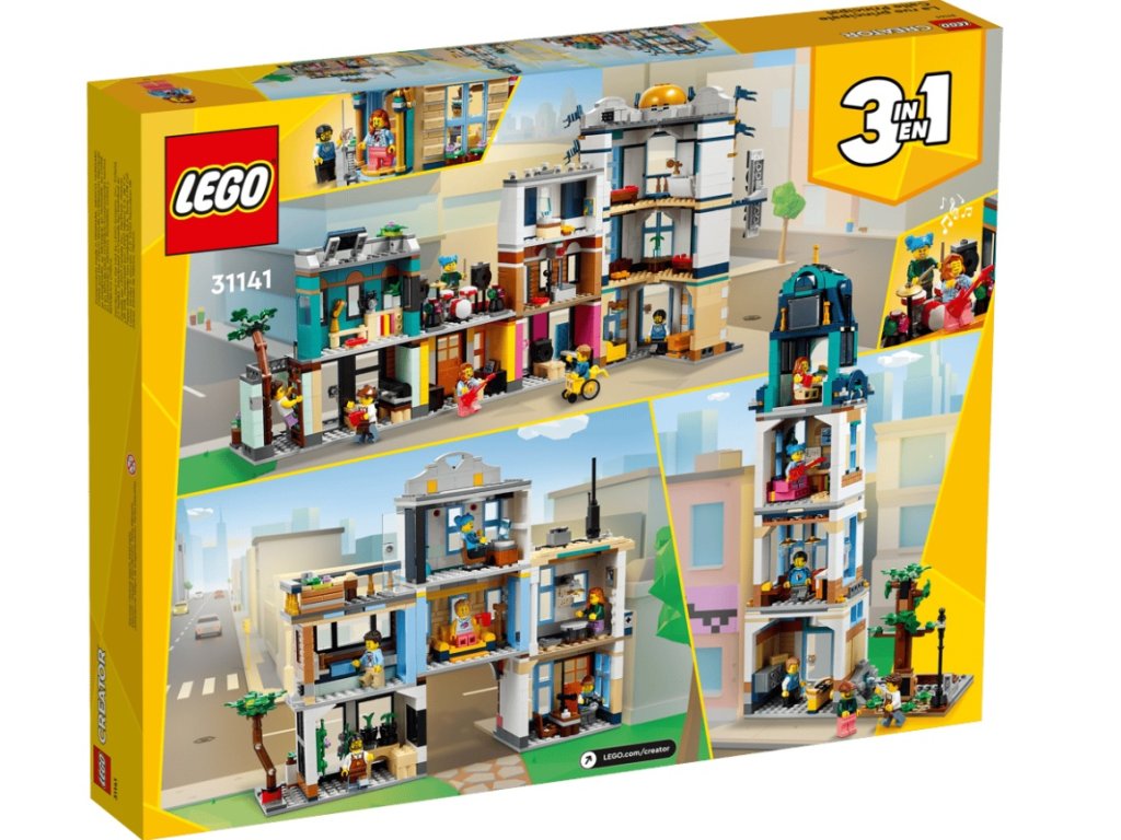 Fanoušci LEGO® od 9 let se mohou těšit na zábavný výlet do města se stavebnicí LEGO Creator 3 v 1 (31141) Hlavní ulice. Obsahuje 4 různé budovy: 3patrový hotel na rohu, obchod s hudbou, na jehož střeše hraje kapela, a kavárnu. Každou budovu můžete připojit a vytvořit tak ulici, nebo je nechat oddělené a hrát si s nimi samostatně.