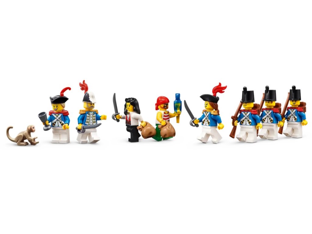 - Co se ukrývá v krabici? – Vše potřebné k sestavení modelu námořní pevnosti, pirátské lidi a člunu, a navíc 6 minifigurek vojáků modrokabátníků a 2 minifigurky pirátů a figurka kostlivce, opice, papouška a kraba