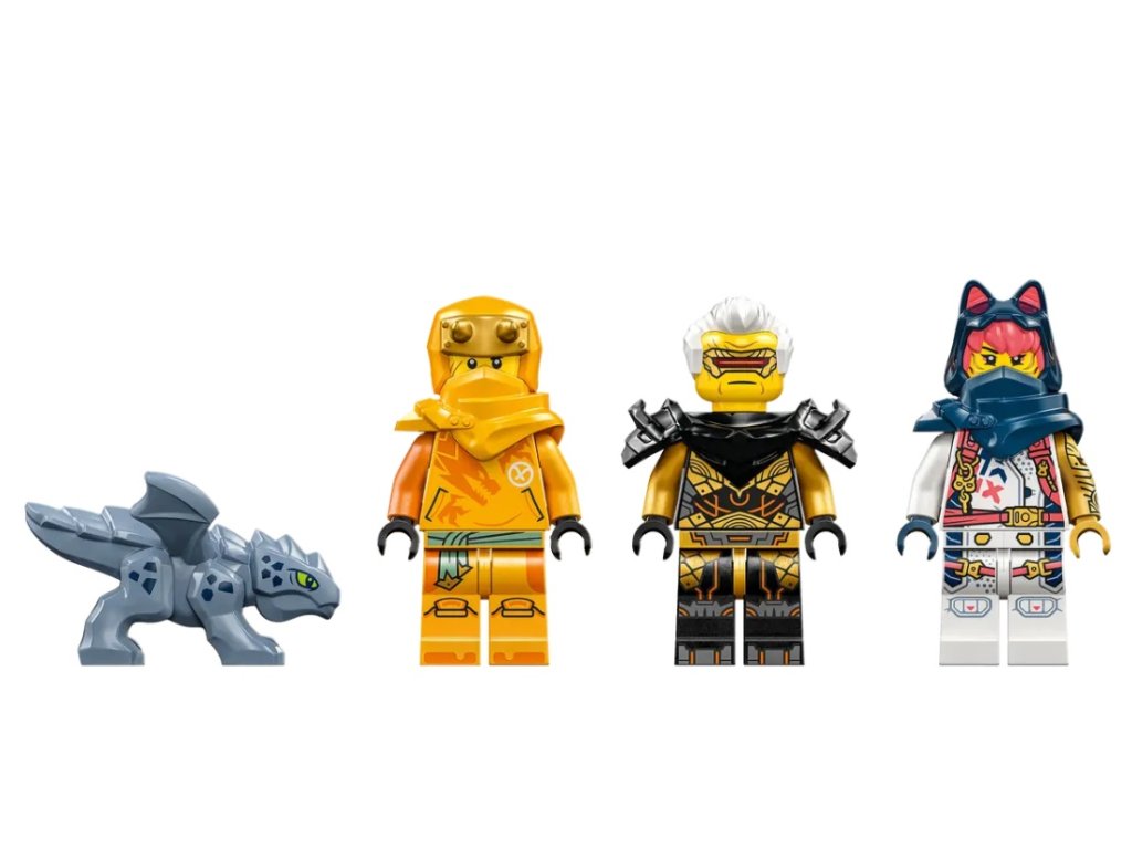 Součástí stavebnice jsou 3 minifigurky: nindžovští učedníci Arin a Sora, lovec draků Rapton a model Riyu jako mládě. Arin je ozbrojen katanou a hákem a Sora má 2 katany. Společně musí porazit Raptona, který třímá císařský meč a cestuje na kluzáku se 2 vystřelovači. Tato stavebnice děti inspiruje k hodinám kreativního hraní s jejich hrdiny.