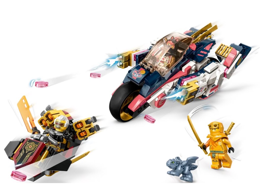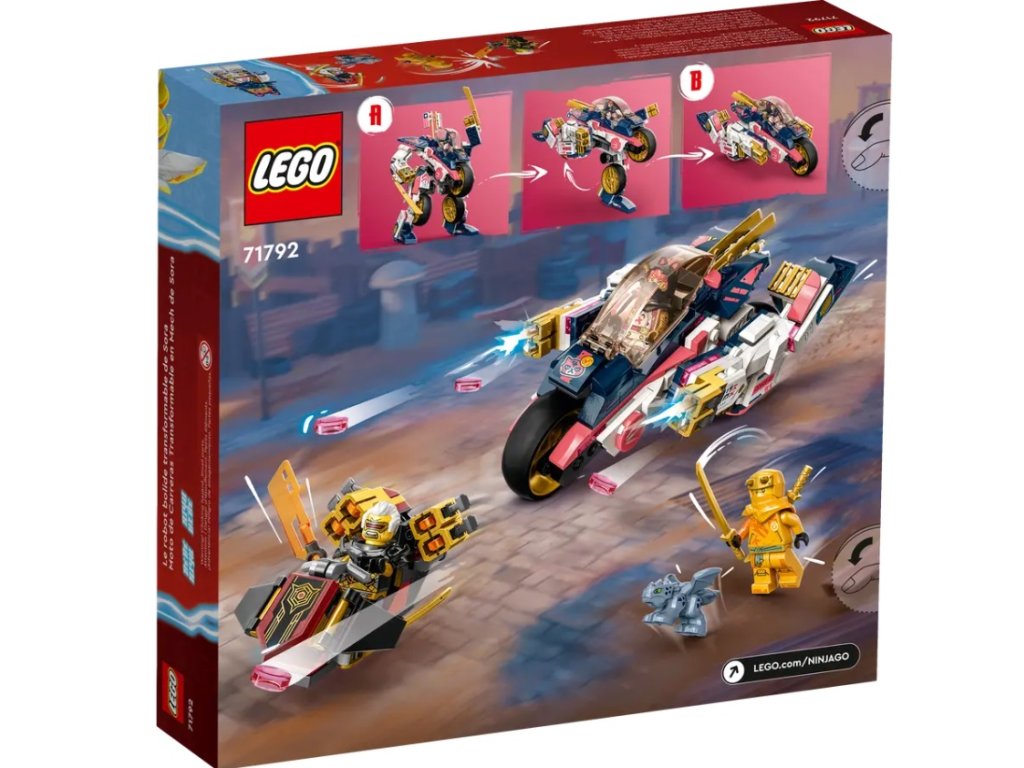 Stavebnice Sora a její transformační motorobot (71792) nabízí všechno, co dětem od 8 let umožní znovu prožít akční scény z televizního seriálu NINJAGO® Dračí povstání. Ve stavebnici najdete polohovatelného robota, který se snadno transformuje do výkonného nindžovského motorobota se zlatými čepelemi a 2 vystřelovači.